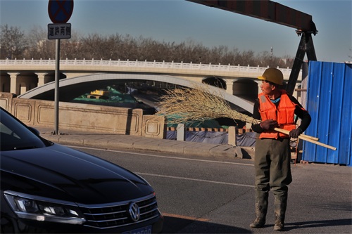 前不久,老桥西侧的新八里桥主体完工,5月底有望通车。届时老桥将禁止机动车通行,并移交给文物部门。 图为一位工人在老桥桥面上清理遗撒的砂石。新桥通车后,老桥桥面的沥青将被清除,露出掩盖已久的石桥板。 白继开 摄
