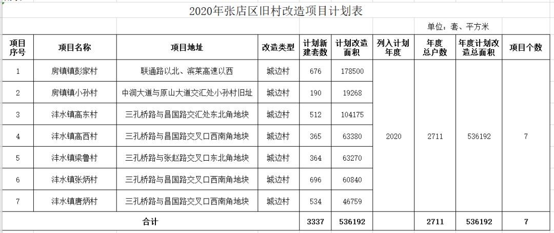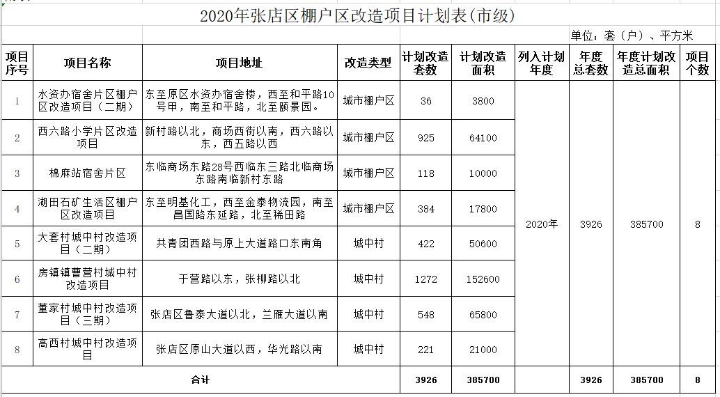 按照市委、市政府部署要求,经区政府研究,制定了张店区棚户区、老旧小区、旧村改造三年行动计划。其中,2020年张店区计划棚户区改造3926套,老旧小区改造2718户,旧村改造项目7个,新建3337套。现将2020年张店区棚户区、老旧小区、旧村改造项目进行公布。请各有关单位认真贯彻落实,按时保质保量完成年度任务。