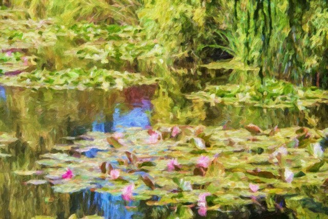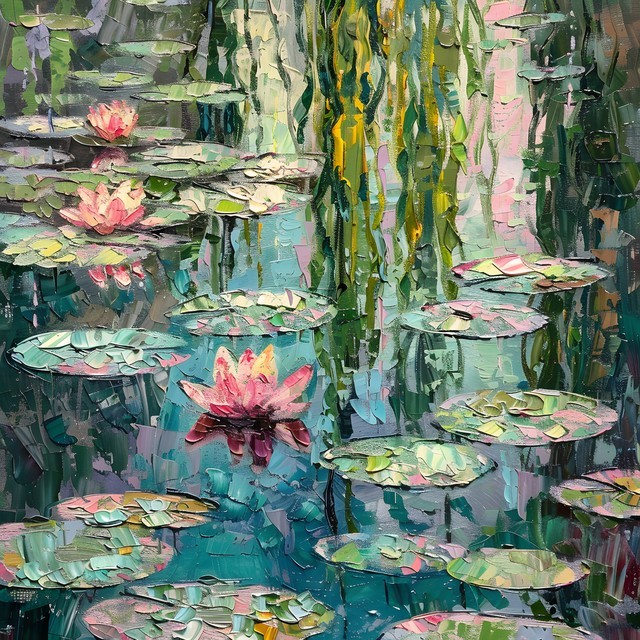 此外,莫奈的《睡莲》系列更是他的巅峰之作。这些作品描绘了他在吉维尼的花园中,睡莲在水面上漂浮的美丽景象。画面中,睡莲与水面的倒影交相辉映,仿佛时间在这一刻凝固。无论是色彩的运用,还是光影的变化,都展现了莫奈对自然的深刻理解和对美的无尽追求。