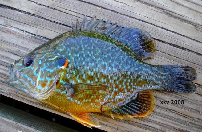 从形态来看,蓝鳃太阳鱼的体型有些似尼罗罗非鱼,外观特征最引人注目的是鳃盖后缘长有一黑色形似耳状的软膜,是所有太阳鱼的一个共同特征,只是不同种其“耳膜”有不同颜色及不同形状而已。