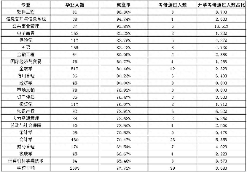 通过上表我们可以看到,软件工程专业就业率为96.30%,位列第一名;信息管理与信息系统专业就业率为94.74%,位列第二名;公共事业管理专业就业率为91.89%,位列第三名。如果按照系部划分的话,金融系为80.49%;会计系为71.31%;计算机系为84.15%,7个系部中表现最好;管理系为73.39%;投资保险系为79.91%;商务英语系为83.43%;法律系为73.48%。