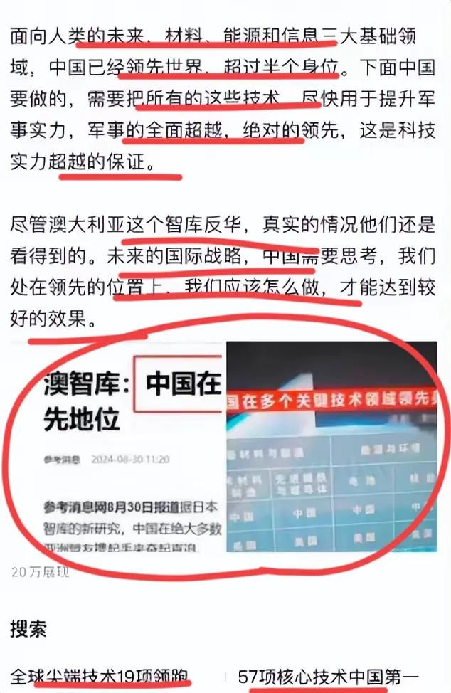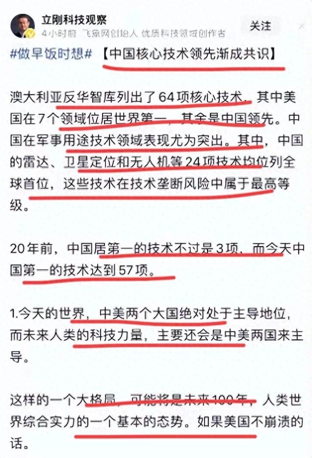原来有媒体报道,澳大利亚的反华智库列出了64项核心技术,只有7项美国领先;