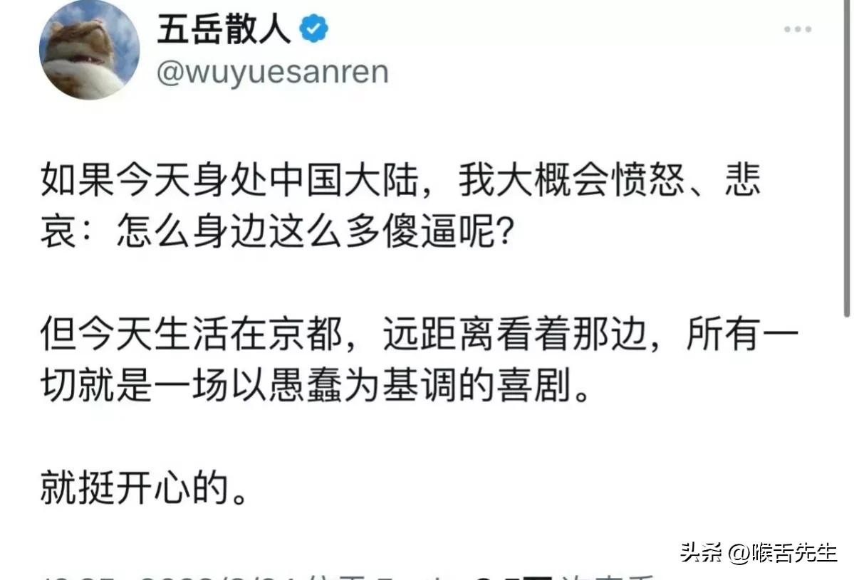 此前,他还充满优越感地表示,如果在大陆,大概会愤怒、悲哀,但现在在京都,就像在看愚蠢为基调的喜剧。