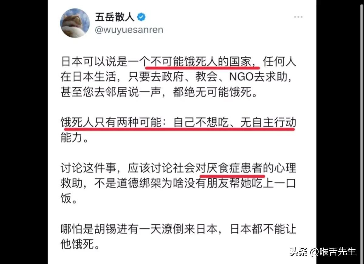 在之前媒体报道日本厌食症女孩去世消息时,五岳散人就急不可耐地跳出来为自己的主子辩解,称“日本可以说是一个不可能饿死人的国家,饿死人只有两种可能:自己不想吃、无自主行动能力”最后还不忘讽刺胡锡进,“哪怕是胡锡进有一天潦倒来日本,日本都不能让他饿死”。