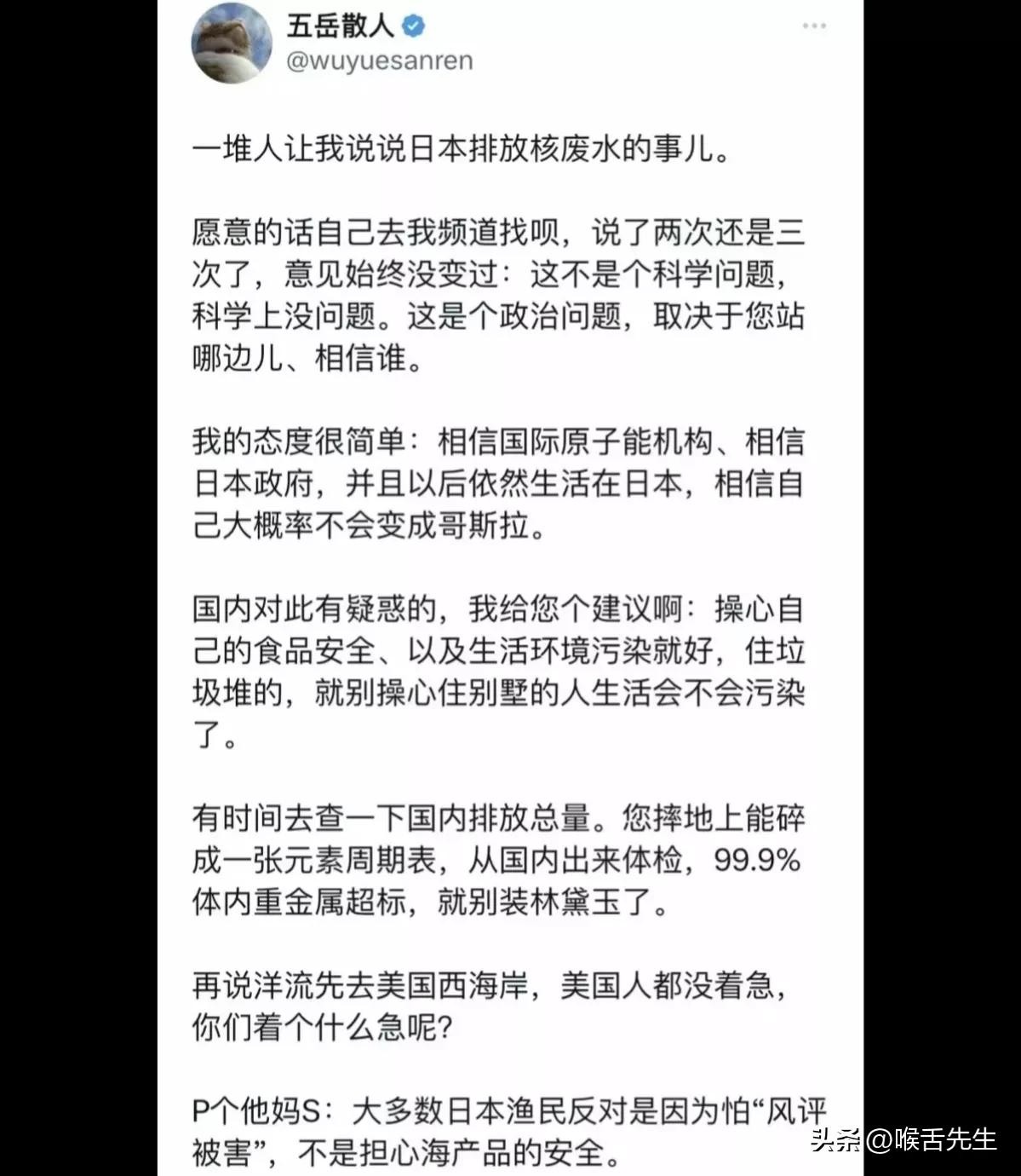 此前日本核废水事件,五岳散人这条好狗自然不肯让自己的主子随地大小便被发现,于是又气急败坏地跳出来攻击国内老百姓,“先关心自己吧”“美国人都没急,你们急什么”