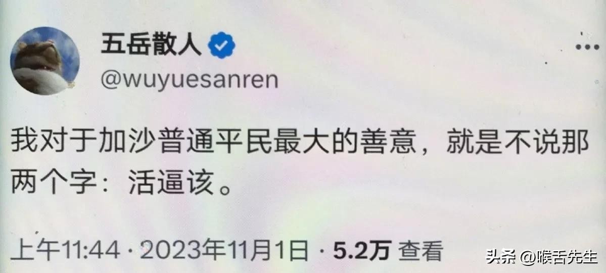 而最近,对于以色列在加沙的所作所为,他更是毫无人性地发表评论称,“我对于加沙普通平民最大地善意,就是不说那两个字:活该”。就这样毫无人性的言论在外网中文社区都能极具市场,而咱们的一个小主持人说日本地震是报应,他们却又双标地表示是“不人道”,实在可笑。