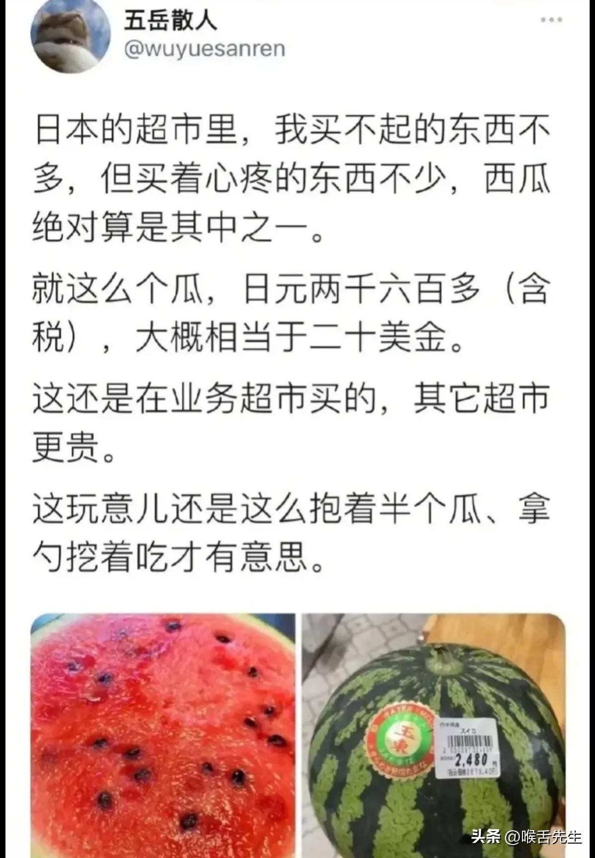 当然,五岳散人也有抱怨日本的时候,“日本超市里我买不起的东西不多,但买着心疼的东西不少,西瓜绝对算其中之一。”(不太理解,超市里还有什么买不起的东西?是日本超市和中国超市不一样?还是这货太穷?)