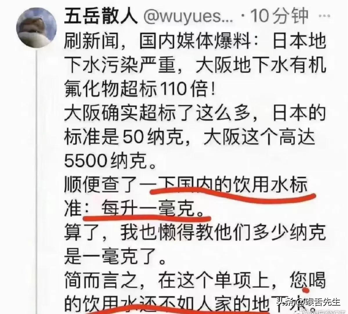 此外在之前媒体报道日本地下水污染的时候,他又急着表现自己的忠心,虽然承认水污染严重,但却不想承认自己过得比国内老百姓差,称“您喝的饮用水还不如人家的地下水”,然而这只是他偷换概念试图为自己挽回尊严。