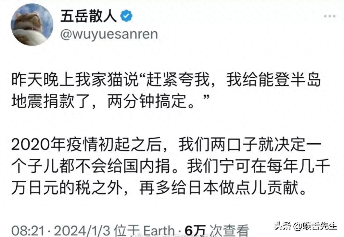 近日,中文互联网初代公知“五岳散人”献媚日本的言行引起大家关注。在日本地震后他屁颠屁颠地捐款,还摇尾乞怜求夸奖,“赶紧夸我,我给能登半岛地震捐款了,两分钟搞定”,还不忘顺便再踩一脚中国,“2020年起,我们两口子就决定一个子儿都不会给国内捐,宁可多给日本做点儿贡献”。