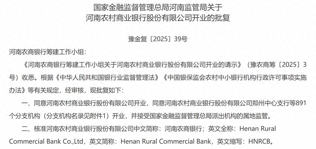 2月26日,金融监管总局河南监管局发布的批复指出,同意河南农村商业银行开业,同意河南农村商业银行郑州中心支行等891个分支机构开业,并接受金融监管总局派出机构的属地监管。
