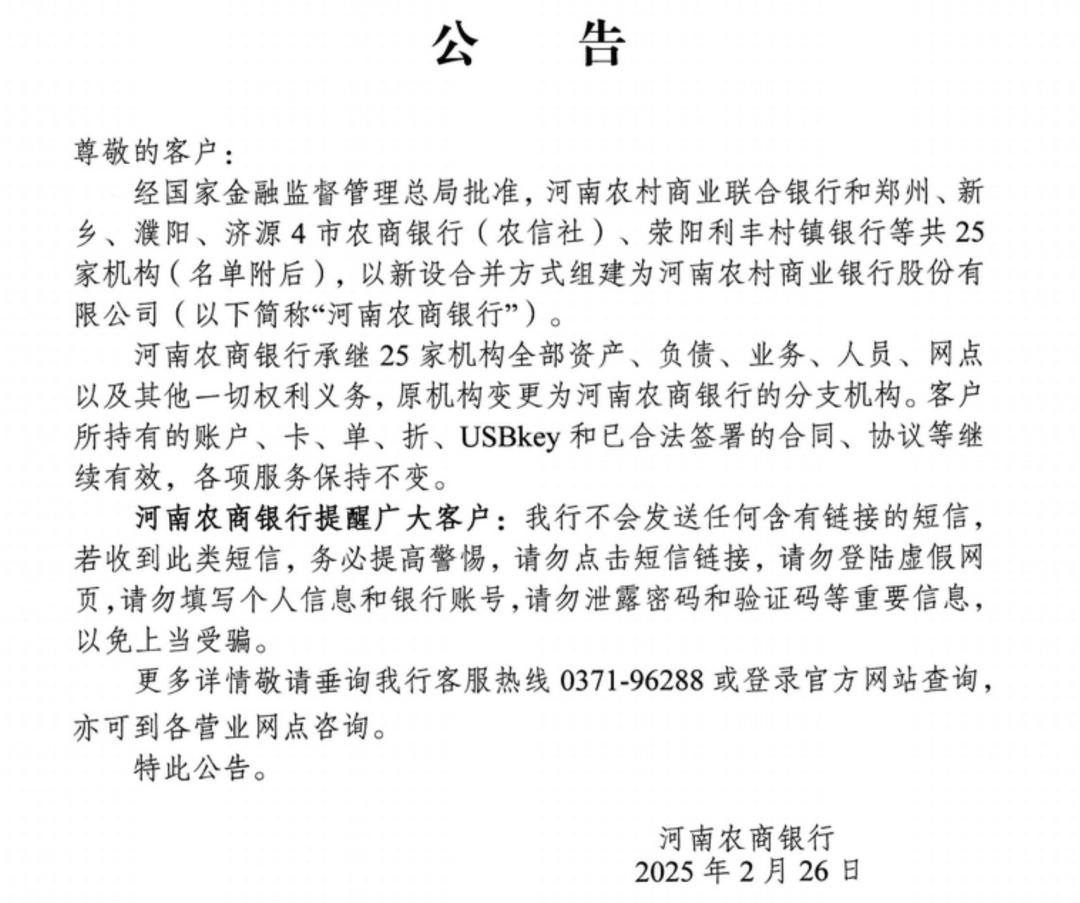 据报道,2月26日,河南农商银行开业仪式在郑州举行。当日,河南农商银行发布公告称,经金融监管总局批准,河南农村商业联合银行和郑州、新乡、濮阳、济源4市农商银行(农信社)、荥阳利丰村镇银行等共25家机构,以新设合并方式组建为河南农商银行。河南农商银行承继25家机构全部资产、负债、业务、人员、网点以及其他一切权利义务,原机构变更为河南农商银行的分支机构。客户所持有的账户、卡、单、折、USBkey和已合法签署的合同、协议等继续有效,各项服务保持不变。