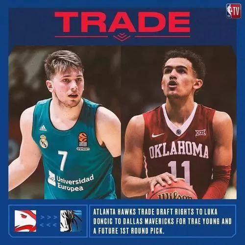 ①老鹰队第3顺位选中的卢卡-东契奇和独行侠队第5顺位选中的特雷-杨互换。职业生涯至今(2021年10月29日,下同):