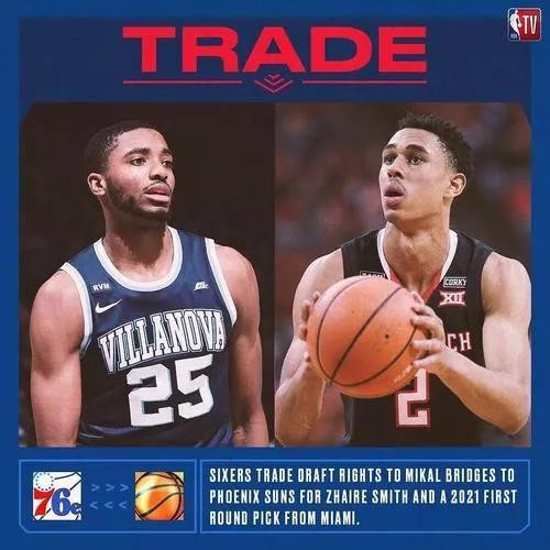 ②76人队第10顺位选中的米卡尔-布里奇斯和太阳队第16顺位选中的扎伊尔-史密斯互换。本赛季至今: