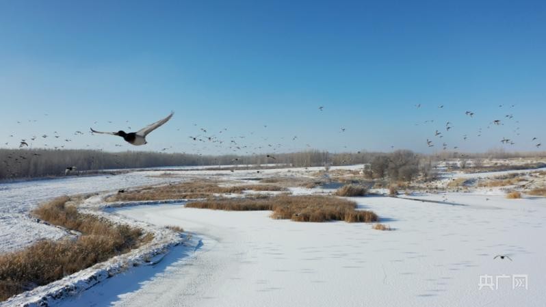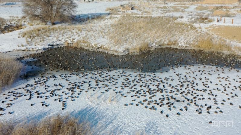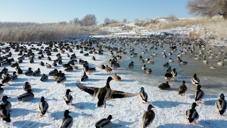 央广网温泉2月1日消息(记者李昊轩 通讯员段梦茹)时至凛冬,位于新疆温泉县查干屯格乡的野鸭湖一片热闹的景象。野鸭湖临近博尔塔拉河,水草丰盛、浮游生物众多,是候鸟的“越冬天堂”。