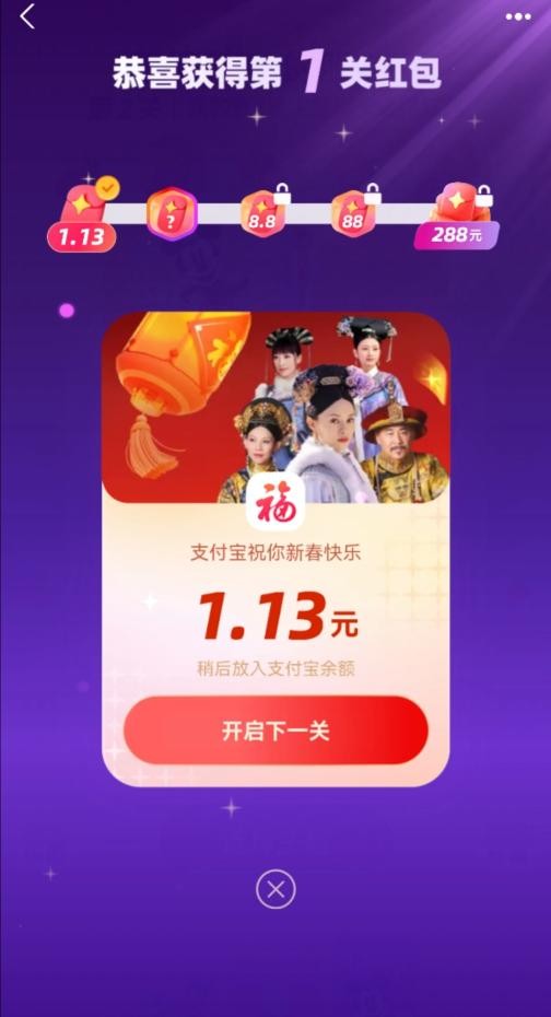 我们体验发现,打开手机大约扫了六七次,就轻松集齐4张卡,合成后获得了“甄嬛传”主题的支付宝app的皮肤,领取红包“开启下一关”,则可以继续闯关合成开奖。开奖不用等到除夕,并且可以一直集福到大年初五,这也是今年集福最大的变化之一。