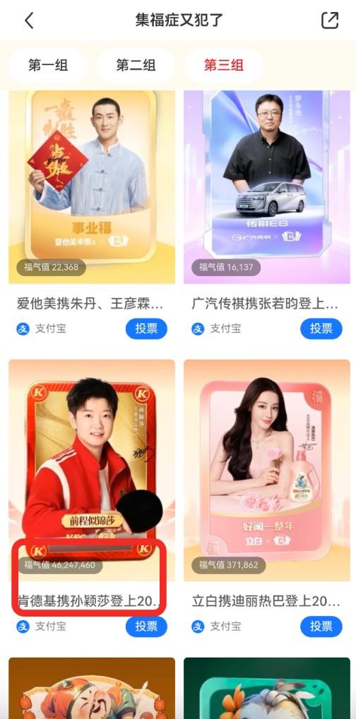 今年,不同主题的福卡成为了集福的最大亮点。1月15日,支付宝发布全新28套主题福卡后,引发用户广泛讨论,射雕福卡火速登上微博热搜,在小红书上,Loopy、封神等IP粉丝开始组队集卡,KFC联名孙颖莎的主题福卡,热度第一,吸引了超过43万人次参与投票。