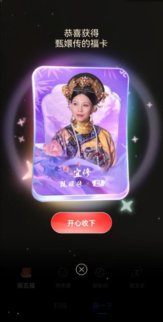 今年的集卡也比较多样,除了经典扫“福”字得卡,还可以扫所选IP主题的相关元素得卡。以“甄嬛传”福卡为例,点击“扫一扫”选择“探五福”,对着甄嬛、皇后等人扫描后,都出了几张不同的甄嬛传系列里的福卡。同时,看视频、碰一下支付也可以得到卡。
