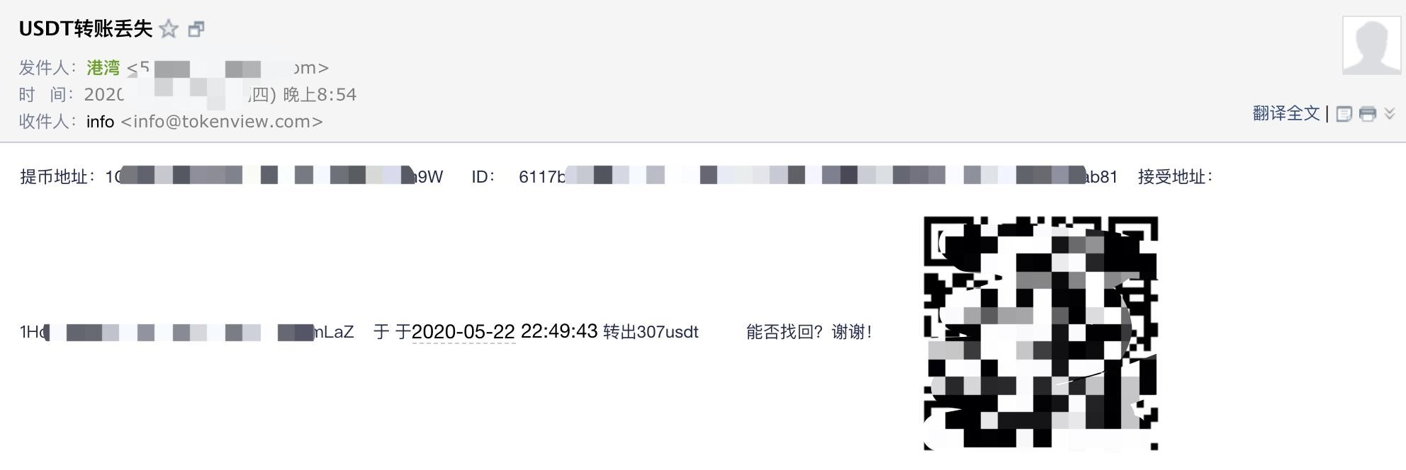 我们在转账之后,有时会出现转账迟迟未到账的情况,很多用户十分着急,甚至认为自己的币丢失了。Tokenview收到了一封来自昵称为港湾用户的求助邮件。邮件中说,该用户在进行USDT转账时发生了USDT丢失的情况。用户提供了提币地址,交易ID,接收地址以及转账金额和转账时间,问是否可以找回。