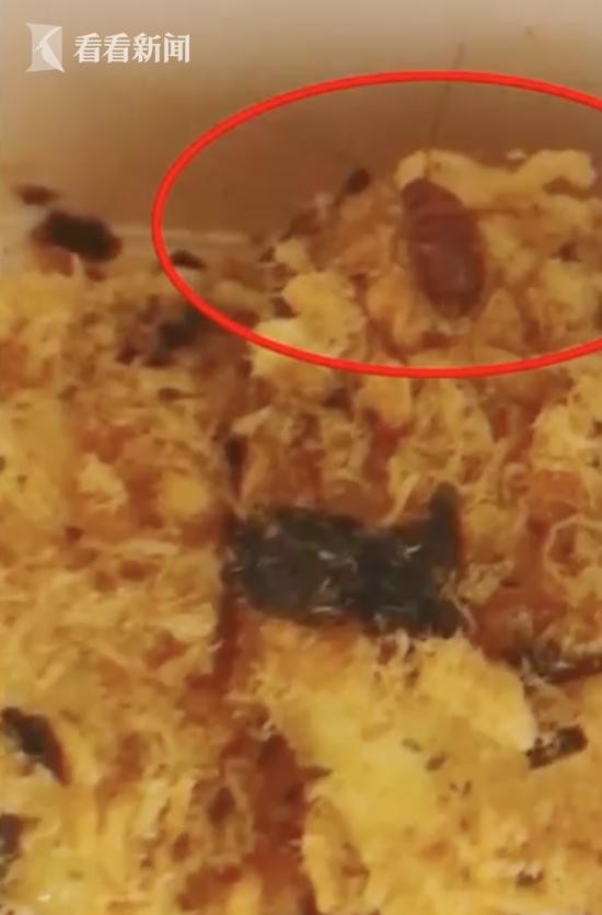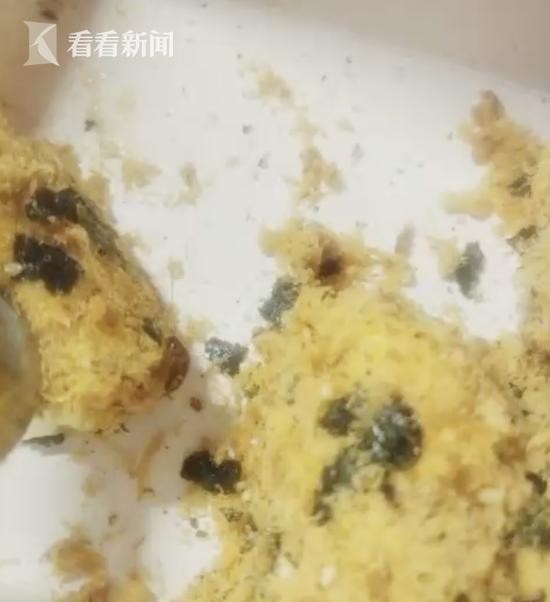 在赵女士提供的视频当中可以看到,蛋糕的表面是一层肉松和海苔沫,而在这上面就有一只棕色的虫子。