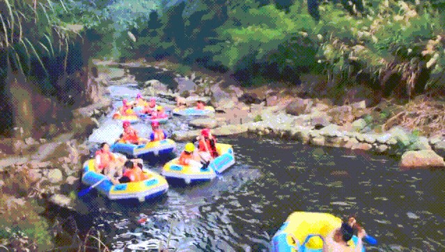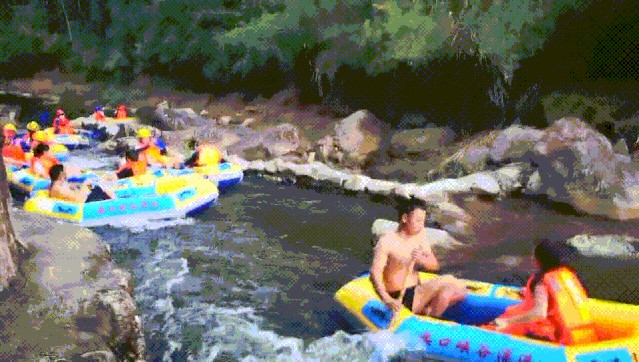 漂流全程有众多险滩和人工水道,水流时而湍急、时而平缓,游客们时而在浪花中随波而下,体验刺激漂行;时而泛舟嬉戏,享受静谧祥和。