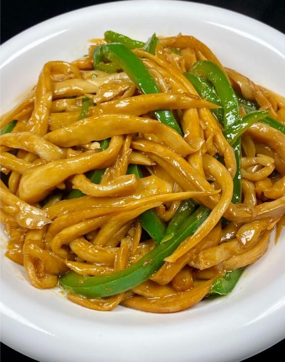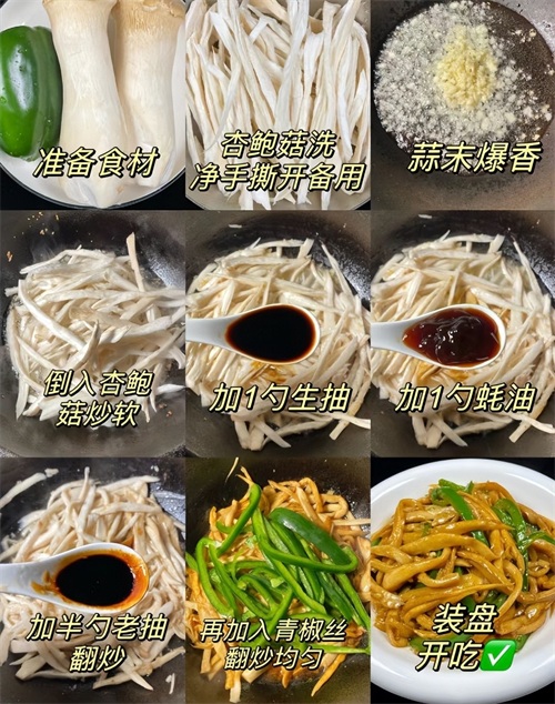 1. 杏鲍菇清洗干净,手撕成条;青椒清洗干净,切成丝备用。