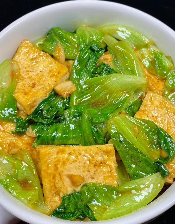 4. 留底油,放入蒜末爆香,倒入煎好的豆腐块,翻炒几下,倒入调好的酱汁,放入生菜,翻炒几下入味,即可出锅装盆。