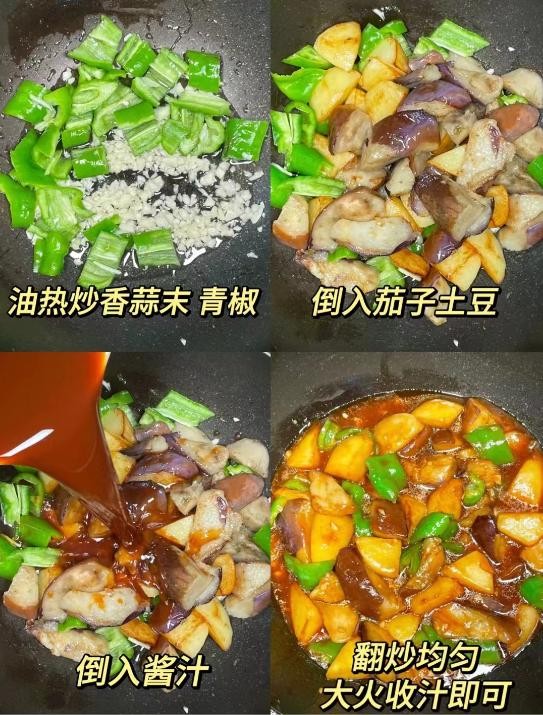 3. 土豆煎至两面金黄盛出,留底油加蒜末、青椒炒香,倒茄子、土豆翻炒。