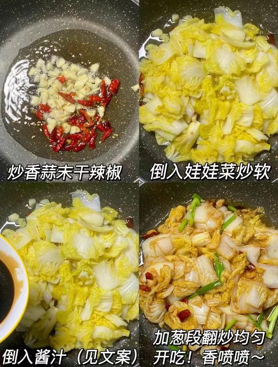 4. 接着倒入娃娃菜翻炒,炒至软熟,再倒入调好的料汁,翻炒均匀,最后放入葱段翻炒几下即可出锅装盘。