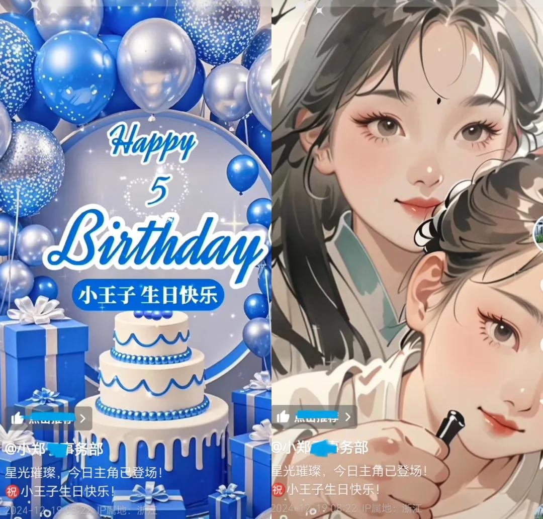 郑爽工作室的账号也在借机塑造她的慈母形象,发了一段视频,祝“小王子生日快乐”,还放出了几张AI生成的亲密互动照。