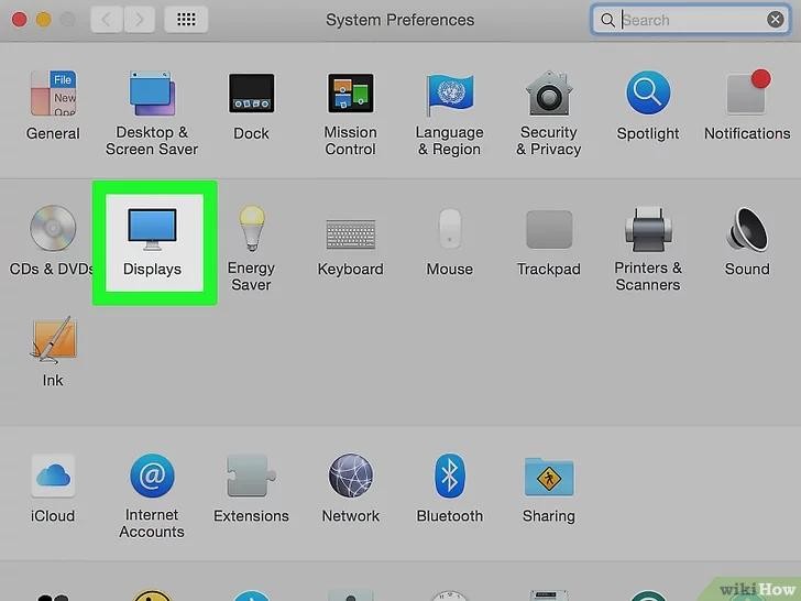 6.尝试旋转内置显示器(OS 10.9和更老版本)。 如果你使用Mavericks操作系统或更早版本的系统,你可以打开显示器菜单,旋转内置显示屏幕。在应用前关闭系统偏好设置窗口。“不要”在OS X 10.10系统或更新系统中进行此项操作,这会导致严重错误。点击苹果菜单,选择系统偏好设置。按住Cmd+Opt,点击“显示器”选项。你的内置显示屏应该有一个可用的旋转菜单。