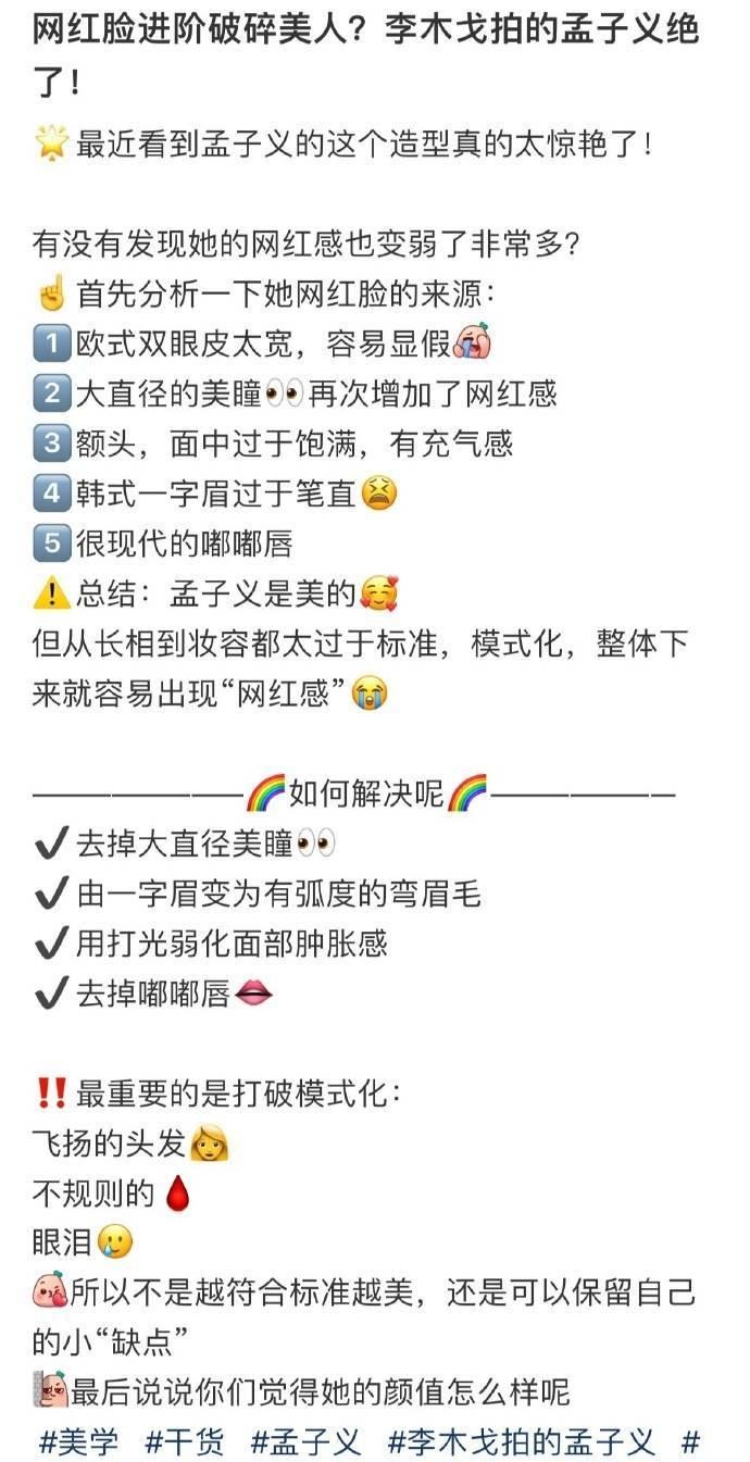 展现她的演技实力。总结:孟子义以网红脸出道,在外貌上常常受到质疑。然而,