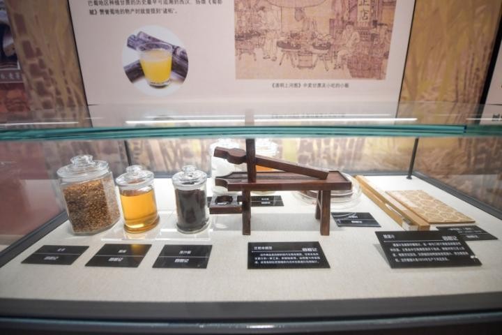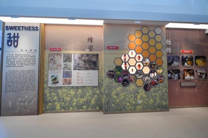 走进A区,首先映入眼帘的是一个原型为汉代的陶俑厨师形象,案板上有鱼、笋、饺子等食材,随后,“咸、酸、苦、甜、香、麻、辣”7个单元的主题展览一一呈现,包含了各种味道的发展历史、制作工艺、代表食品等的文图资料、实物展览。