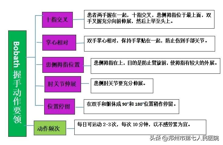 注意事项:在波巴斯握手时,患侧拇指要始终置于最上面,摆动时候需要保护患者肢体,避免幅度过大损伤关节。