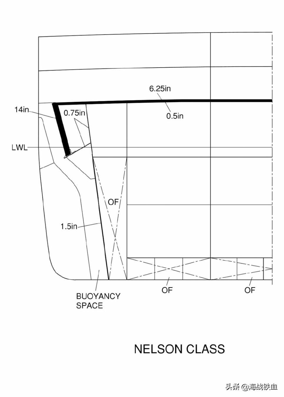 在条约35000吨排水量的限制下,设计师只好最大限度缩减装甲带长度,纳尔逊主装甲带全长116.4米,只占舰体全长54%,与后来的条约型战列舰相比所占比率是最低,主装甲带高3.9米,并没有较好的防护水线以下,对水中弹几乎没有防护,只能依靠38mm的防雷装甲。但是上缘与中甲板平齐,防御垂直打击能力较强。