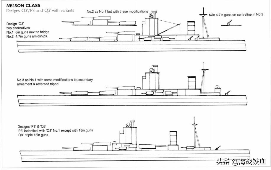 1922年,造舰局根据海军部1921年底提交的备忘录重新进行了设计,这三艘代号O3、P3、Q3的战舰中将产生纳尔逊级的备选方案,其中P3和Q3因为吨位限制只能装备15吋火炮被海军部淘汰,剩下了O3方案。