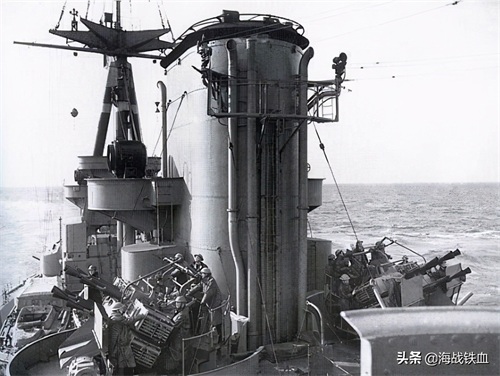 防空火力:六座单联装MarkVIII型120毫米高平两用炮,四座双联装100毫米高平两用炮,六座八联装41毫米“砰砰”机关炮,61门20毫米“厄利孔”机关炮