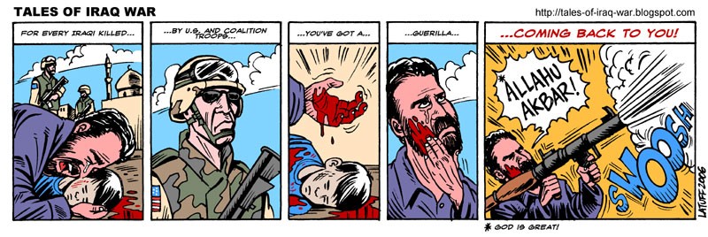 讽刺联军攻占伊拉克的军事行动只会导致当地冲突更加严重的漫画。