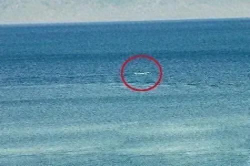 当时在场的记者胡维斌发现了这一情况,连忙拿出相机想要拍了下来,但可惜当时它的相机镜头是105毫米的,所拍的画面不够清晰,不过通过照片还是可以看到,不明水物种掀起的白色浪花和水波波纹。