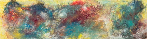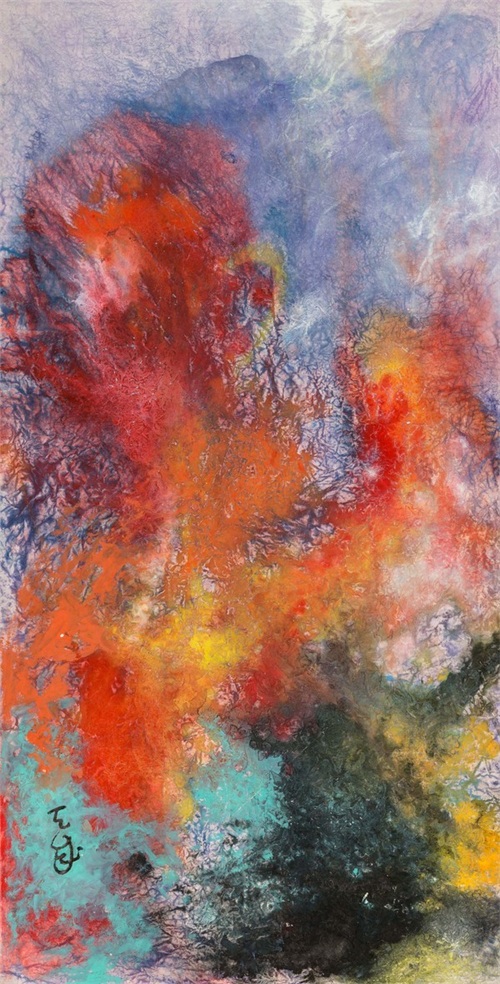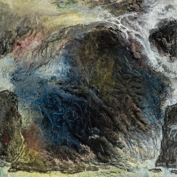 谢天成,由西画入水墨,并自学张大千在青绿山水革新中的语言,尤其精研张氏泼墨、泼彩法,且因缘际遇,得以追随刘海粟研习 大写意山水,学业精进,为日后的大写意山水探索奠定了深厚基础。他的艺术探索之路,也是一直追随刘海粟开创的中西融合之路,尤其在泼墨、泼彩法上的精进,从而走出了一条我称之为“彩韵墨象”的中国当代山水画突围新路。