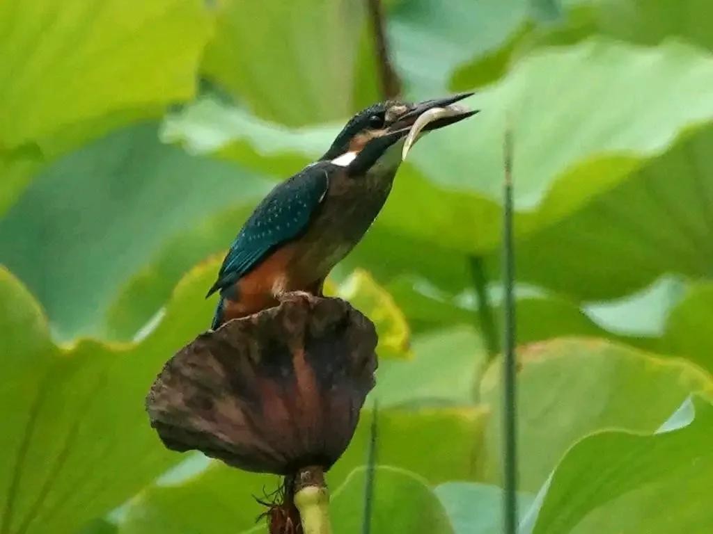 更令人称奇的是,翠鸟的脑袋拥有360°旋转的惊人能力,这让它们在捕食时能够迅速定位并捕捉目标。它们的主要食物是河里的小鱼小虾,当捕捉到这些活泼的小生命时,如果它们还敢挣扎反抗,翠鸟便会展现出其机智的一面,用它们那坚硬的鸟嘴轻轻敲击,将猎物敲晕后再享用,这一行为无疑展现了翠鸟作为捕食者的智慧与策略。