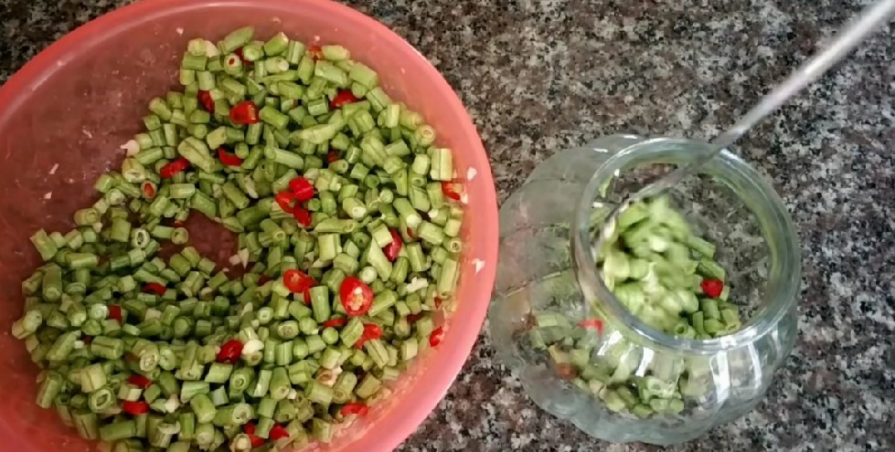 加入适量的盐,盐比平常炒菜的时候多一点点就可以了,再倒入一小勺高度白酒,搅拌均匀。准备玻璃罐,用开水烫一下杀菌,把我们弄好的豆角装进去。