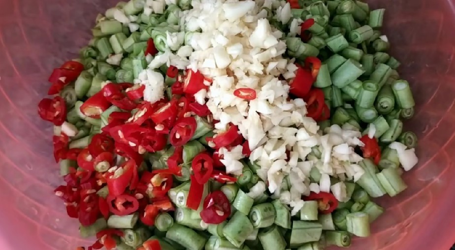 沥干水分之后把它切成小段放盆中备用,把用到辣椒,蒜头清洗干净,沥干水分,然后切碎,和豆角放一起。