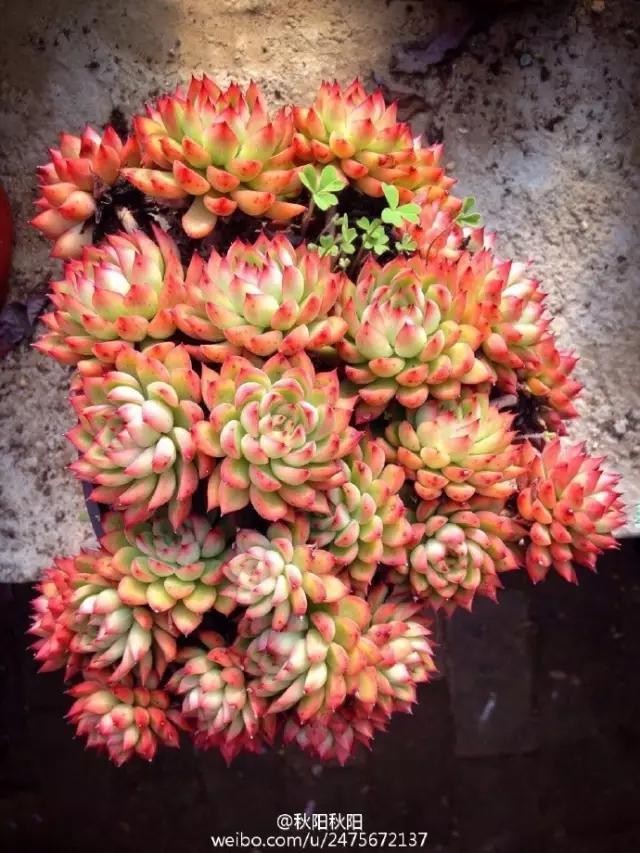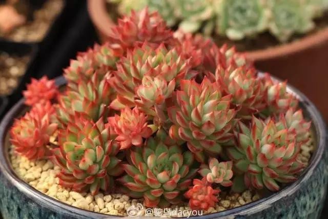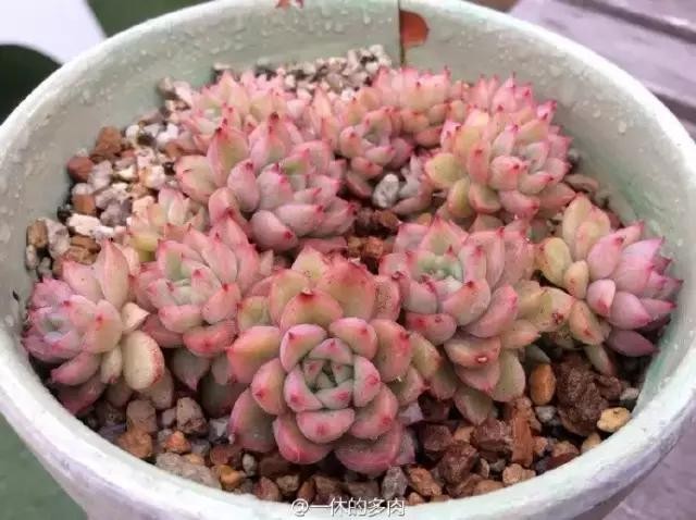 这是多肉君自己养了一年的女雏,从一个不到6cm小单头养成12cm盆都装不下的大群生。