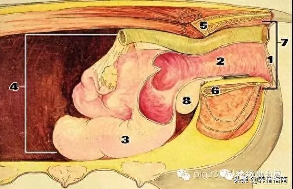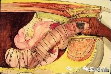 3.子宫:图示子宫为缩小版,真实母猪子宫拉长之后可以达到1.5-1.8m。猪的子宫是双角子宫,每个长长的子宫角中挤满了待产的仔猪。
