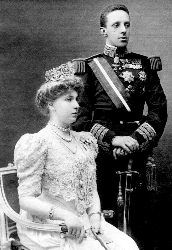 阿方索十三世,他的妻子是来自苏格兰巴腾堡的的维多利亚·尤金妮亚。苏格兰是英国的一部分,这样说,西班牙王室也有英国人的血液。不过维多利亚·尤金妮亚和英国王室相对远一点。不过维多利亚·尤金妮亚的母亲是维多利亚女王的小女儿索菲亚公主。这样看的话,西班牙王室里确实有英国王室的血液。