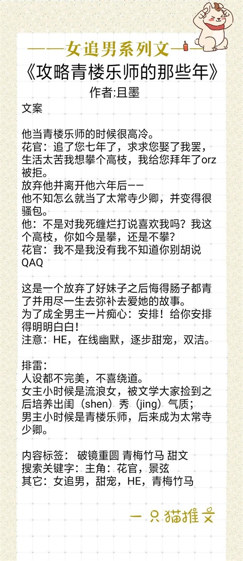 女主本是个无父无母的小乞丐,每天为一口吃的而奔波挣扎,十岁那年混进青楼找吃的时遇见男主,惊为天人,从此开启长达七年的死缠烂打求爱之路。男主是家道中落,沦落青楼的乐师,以此谋生。一开始男主很嫌弃女主,但是对女主的死缠烂打又无可奈何,在日复一日的相处中爱上女主,不过因为男主对女主的爱太过于内敛,女主看不懂看不透,以为男主一直都讨厌自己。直到后来女主离开了男主,男主后悔莫及,一直在等女主回来,六年后女主终于回来了,就开始虐男主了,最后男主也飞黄腾达了,两人he,撒花。