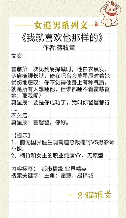 女主摄影师,男主前无国界医生,现霸道总裁。前期女追男,但男主那个冰山就是不为所动,后面当然就是大型的打脸追妻现场。后面在一起以后就是特别宠,甜甜的恋爱日常,男主还带上保镖去帮女主打架哈哈哈。