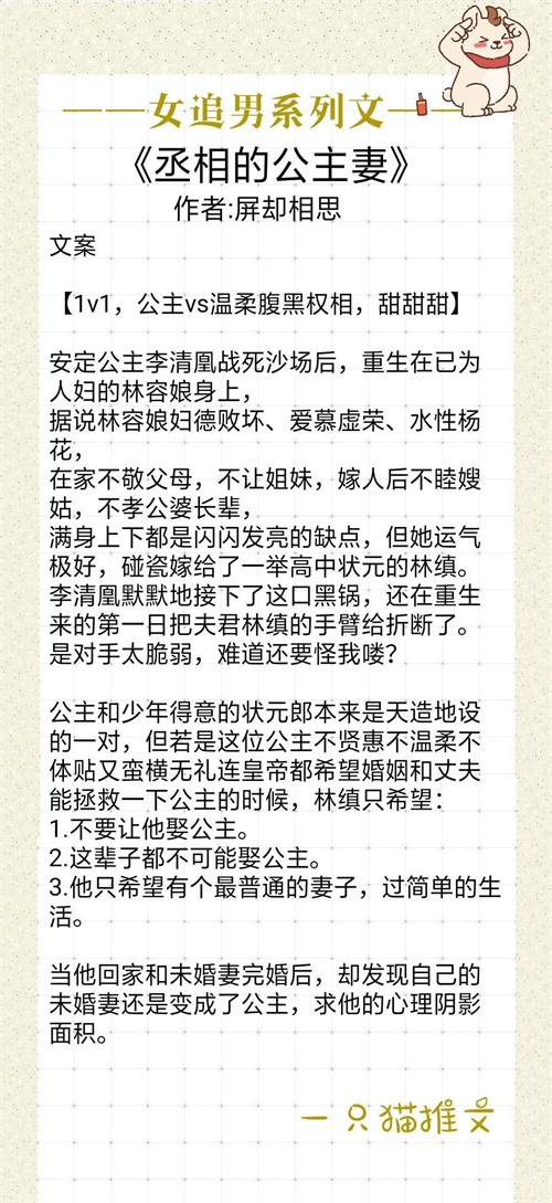男主懂医理,会做家务,读个书还能考上状元,冷冷清清,高贵矜持,年纪轻轻更是官拜丞相,最最重要的是长得好看!是全京城少女恋慕的对象,公主也不例外!