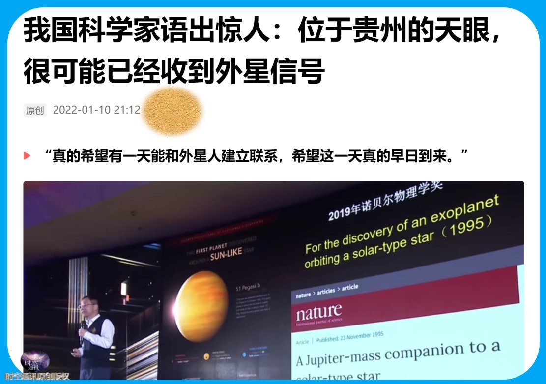 说这话的科学家是中国科学院FAST重点实验室主任,国家天文台研究院研究员彭勃。他这番话是在中科院2022年跨年演讲直播中说的,原话大意是:中国“天眼”很可能已经接收到了外星文明发出的信号,只不过还没有最终确认罢了。
