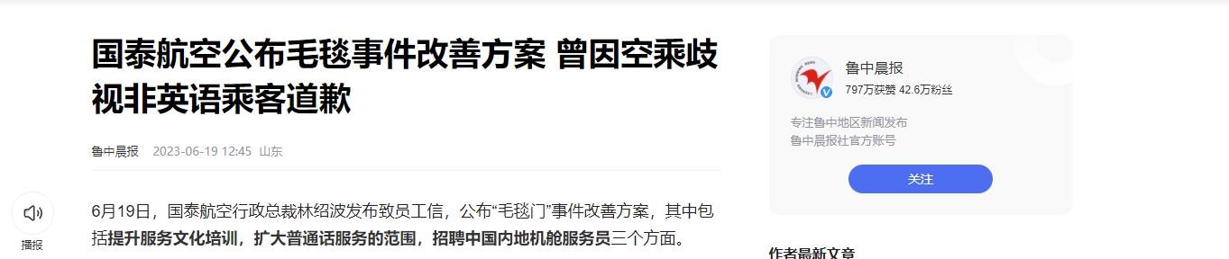 2023年5月23日,国泰航空因一起“毛毯事件”陷入了舆论的漩涡,事情的起因是一位乘客因为英语不好,把“毛毯”(blanket)误说成了“地毯”(carpet),结果遭到了空姐的冷嘲热讽,甚至被拒绝提供毛毯。
